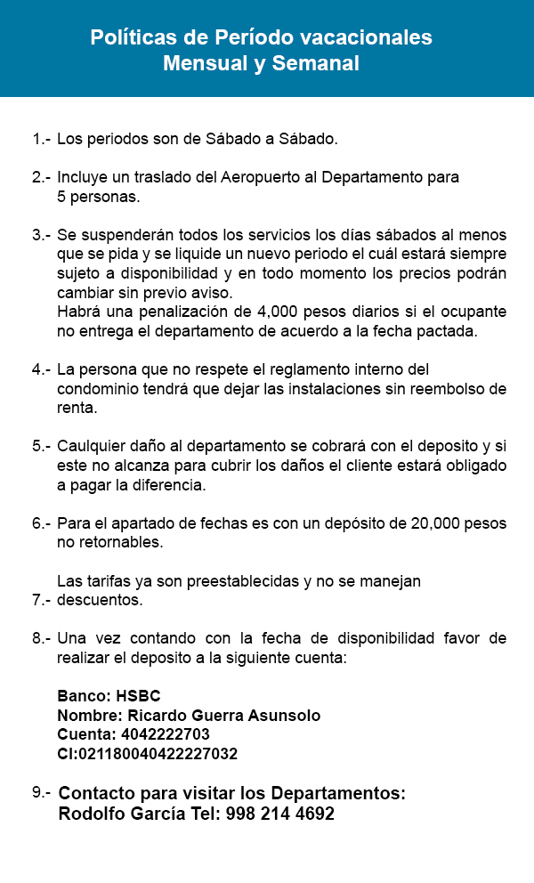 | Incluye | Mantenimiento del Condominio | Esta pagina es informativa y las condiciones y precios podrán cambiar sin previo aviso favor de confirmarlas via telefónica a los teléfonos que están en la pagina | |||